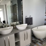 Your vacation home includes 3 bedrooms, each with its own bathroom. From each room you have sea view. The southeast facing master bedroom impresses with its spaciousness and the modern integration of the bathroom. Highlight of the bathroom is definitely large double shower area: enjoy sea view while showering. The walk-in closet is also very practically designed in the attached room.
